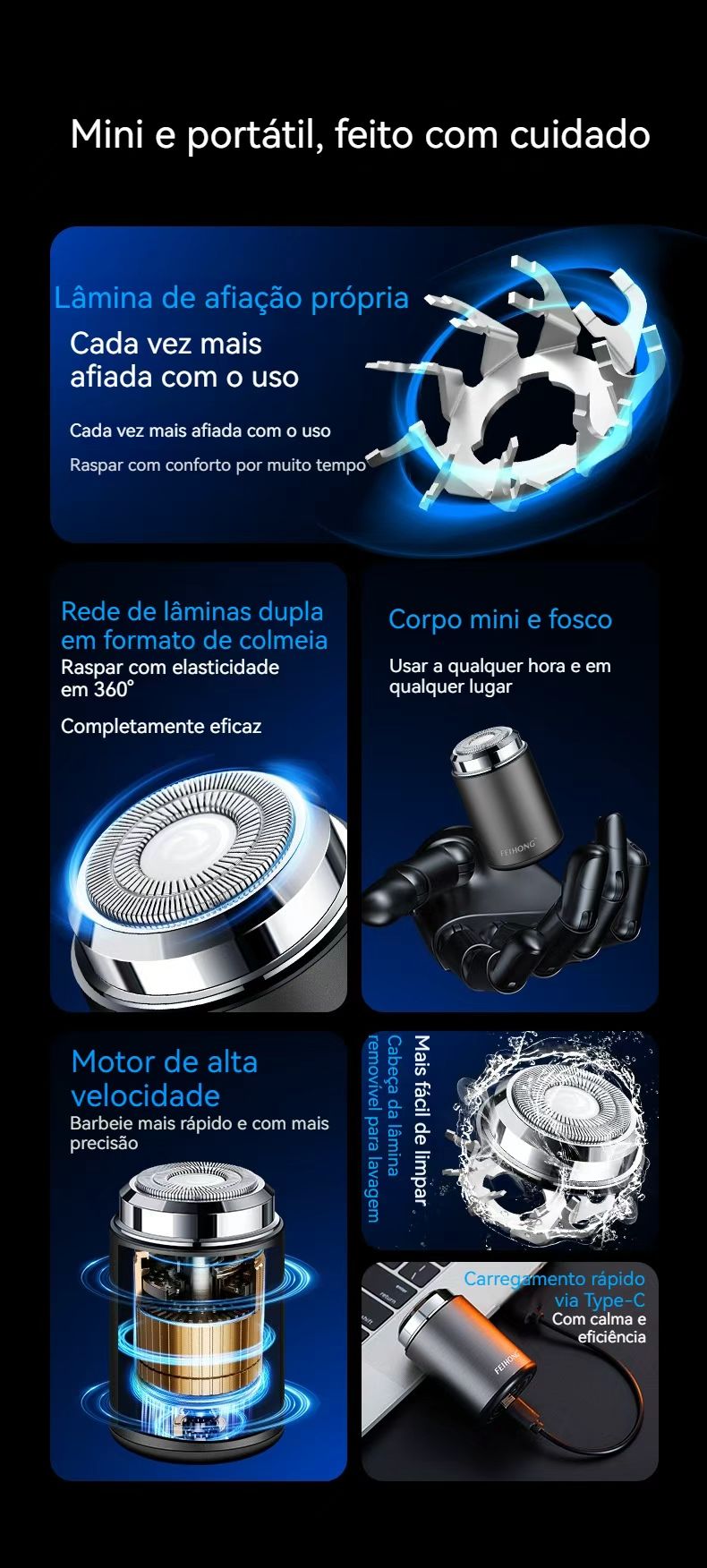 ✅ Lavável (IPX6):Cabeça do barbeador pode ser lavada diretamente na água (limpeza rápida e higiênica).